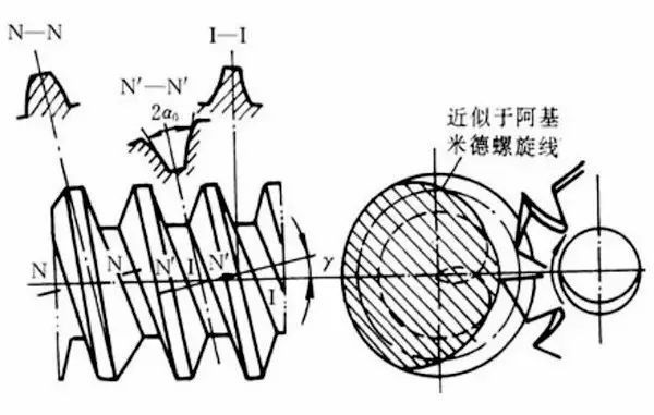 這種蝸桿的端面齒廓為延伸漸開線,法面(N—N)齒廓為直線。ZN蝸桿也是用直線刀刃的單刀或雙刀在車床上車削加工。